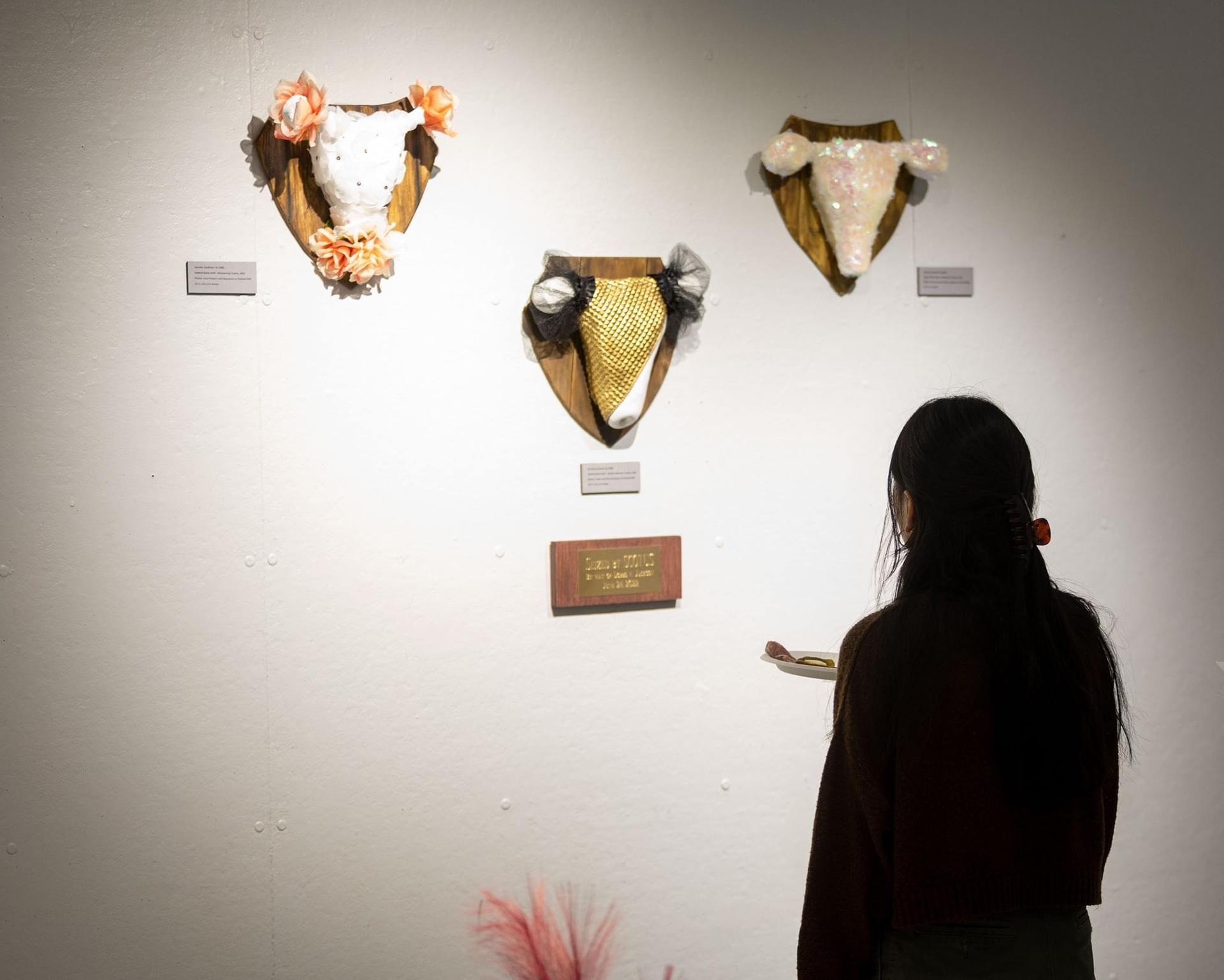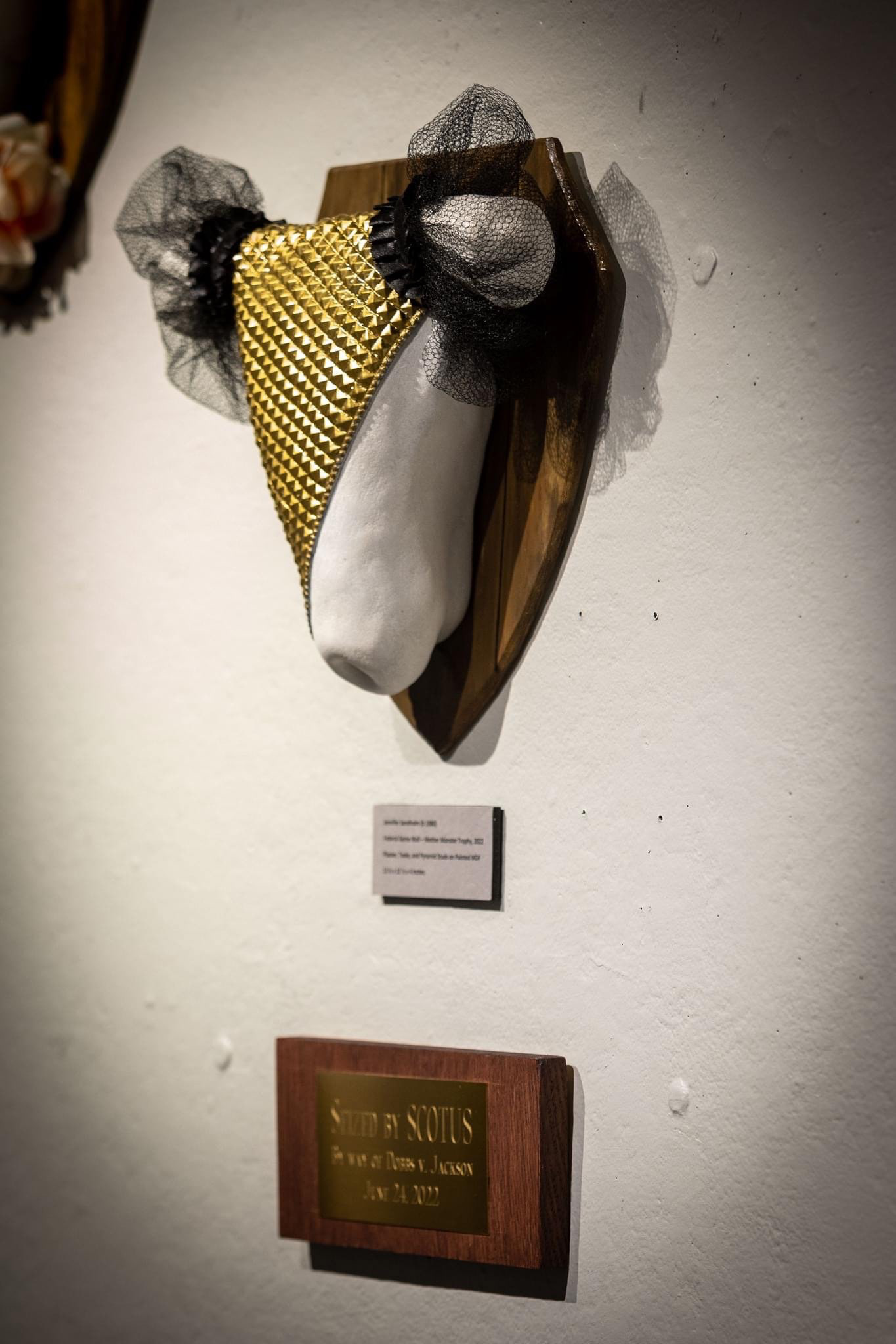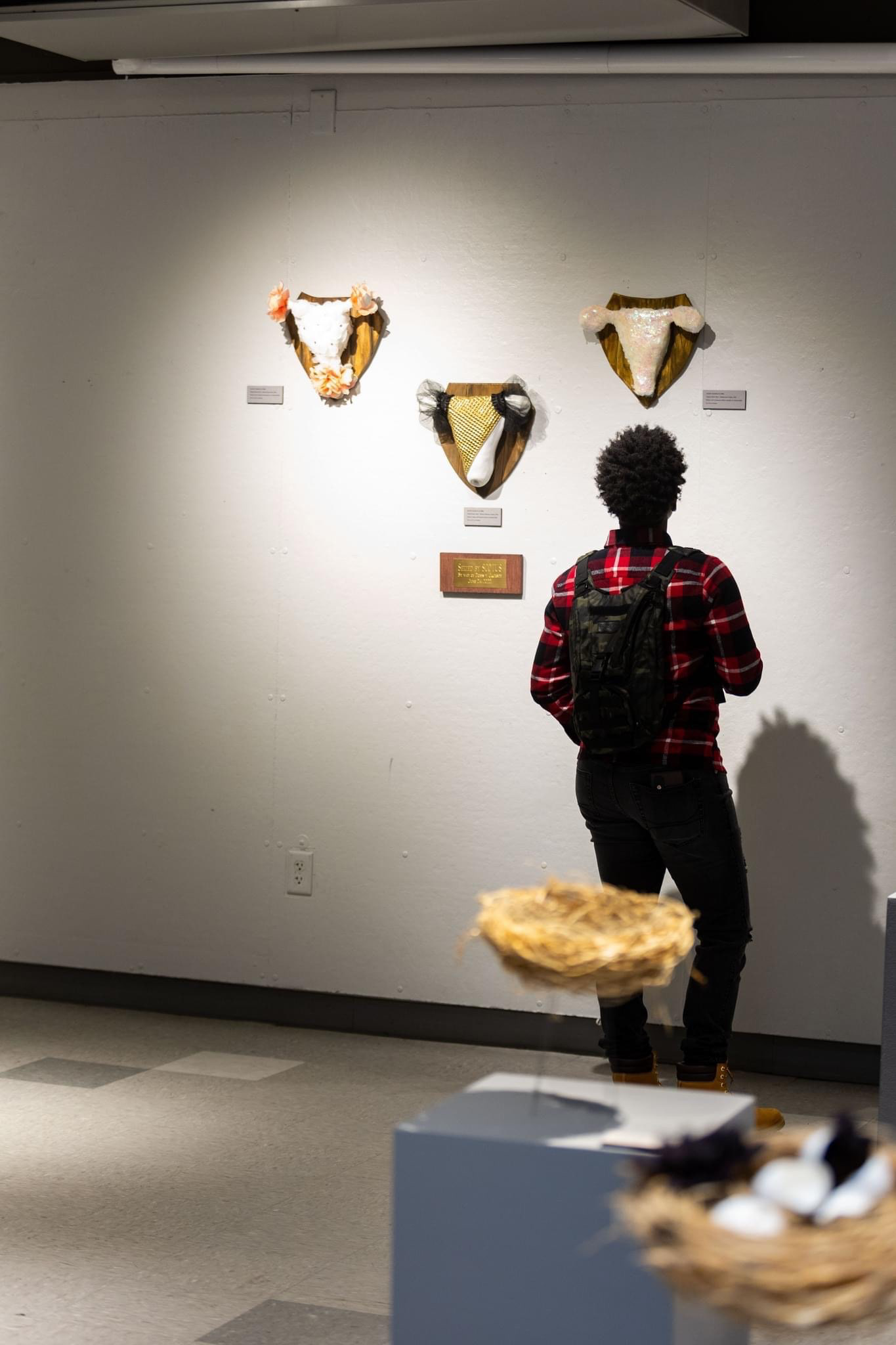 My designs interweave concepts and art for a multilayered experience using imagery, symbolism, and metaphors, meant to link feminine power and energy to the body for the purpose of removing harmful stigmas and taboos. The triptych series, Colonized Feast, is a visual tale revealing the consumption of Divine Feminine. This representational journey exposes the imbalance of masculine and feminine energy through the male parasitic eating of the flourishing tree. The spirit of imbalance is further expressed in, Pound of Flesh, where women’s objectification is measured against patriarchal accomplishments. I use ironic symbolism and marketing catchphrases to embrace diversity and inclusion with nylon pantyhose in, Everyday Shade. At the center of, Sheer Brilliance Terrestrial Garden, harsh beauty standards are challenged with the combination of manmade products and toxins to maintain a youthful appearance for the social gaze. Women’s bodies are uniquely miraculous, and yet bodily autonomy and generational grooming enforce the standard that women’s sole purpose is to breed and continue the race, To Nest or Not to Nest, is a woven tribute to womb sovereignty. The lack of freedom of our bodies reminds us of the horrible event on, June 24th, 2022, when many state governments passed legislation outlawing abortions, this legislative pursuit of women’s reproductive rights became the focus of my series, Federal Game Wall, the imagery implies the hunt and seizing of women’s uteruses by governmental powers in their big game abortion expedition.